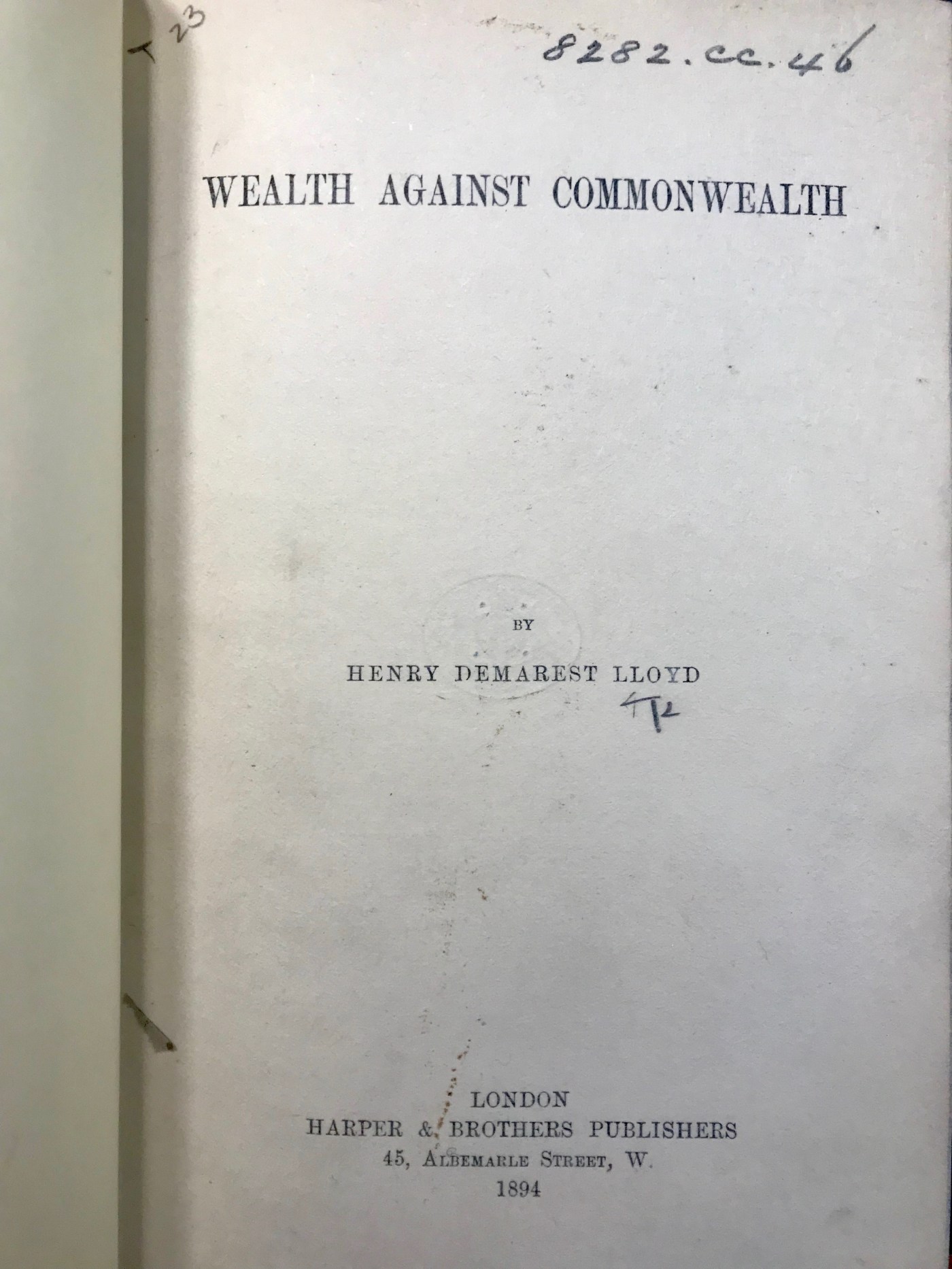 Henry Demarest Lloyd wrote Wealth Against Commonwealth in 1894. He was an editor, journalist, and a wildly passionate political activist. Wealth Against Commonwealth was written predominantly to expose monopolies, particularly Standard Oil, and how their extreme wealth was bad for the commonwealth of the people. He wrote during the Gilded Age, but this is all the more relevant today.